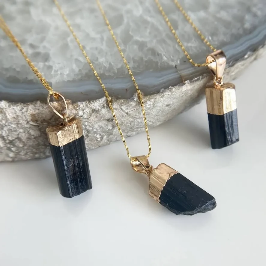 Black Tourmaline Raw Golden Pendant – The Stone of Protection and Grounding